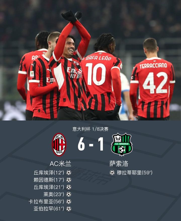 AC米兰6-1萨索洛:米兰大胜晋级意大利杯八强