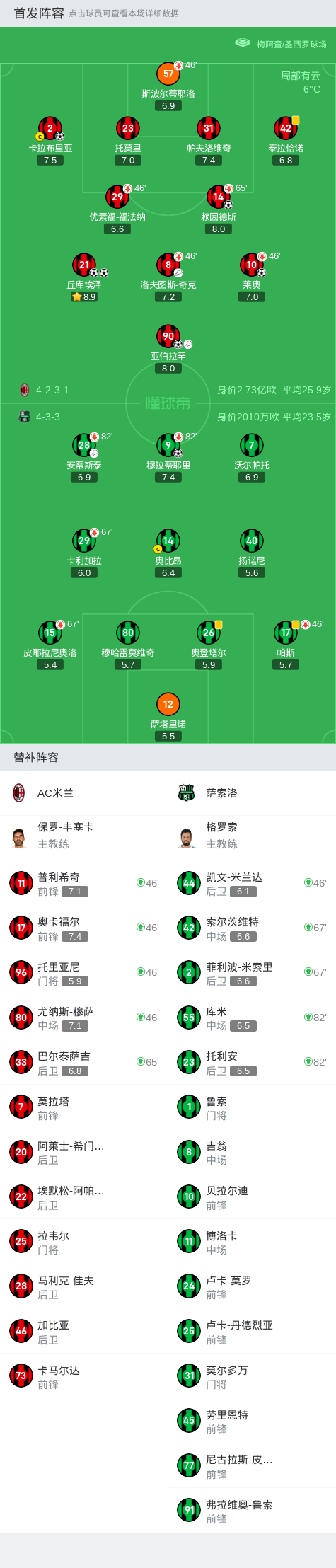 比赛过程中,双方球员的拼抢激烈,赛场上出现了多个精彩瞬间。比如第2分钟,奇克一脚左脚射门,萨索洛门将及时扑出,为球队守住了第一城。第7分钟,莱奥突破时被犯规,主裁示意犯规但未给出黄牌。而第9分钟,亚伯拉罕的头球攻门因为越位在先被判无效,米兰错失一次得分机会。