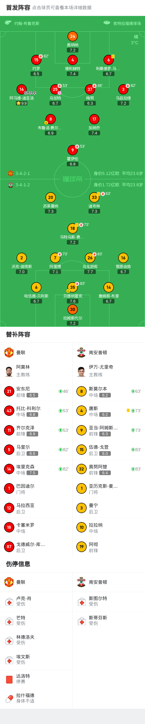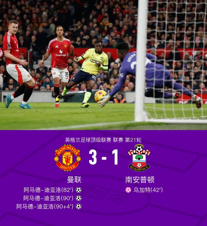 比赛第43分钟,曼联在防守中犯错,乌加特打入一球,让南安普顿领先。第59分钟,加纳乔传球门前,安东尼却未能把握机会将球打进。第82分钟,阿马德-迪亚洛在禁区内两连击得手,将比分扳平为1-1。随后,他在90分钟时再次破门,助曼联反超比分。最后一刻,南安普顿后防失误,阿马德-迪亚洛戴帽完成帽子戏法,曼联最终以3-1获胜。